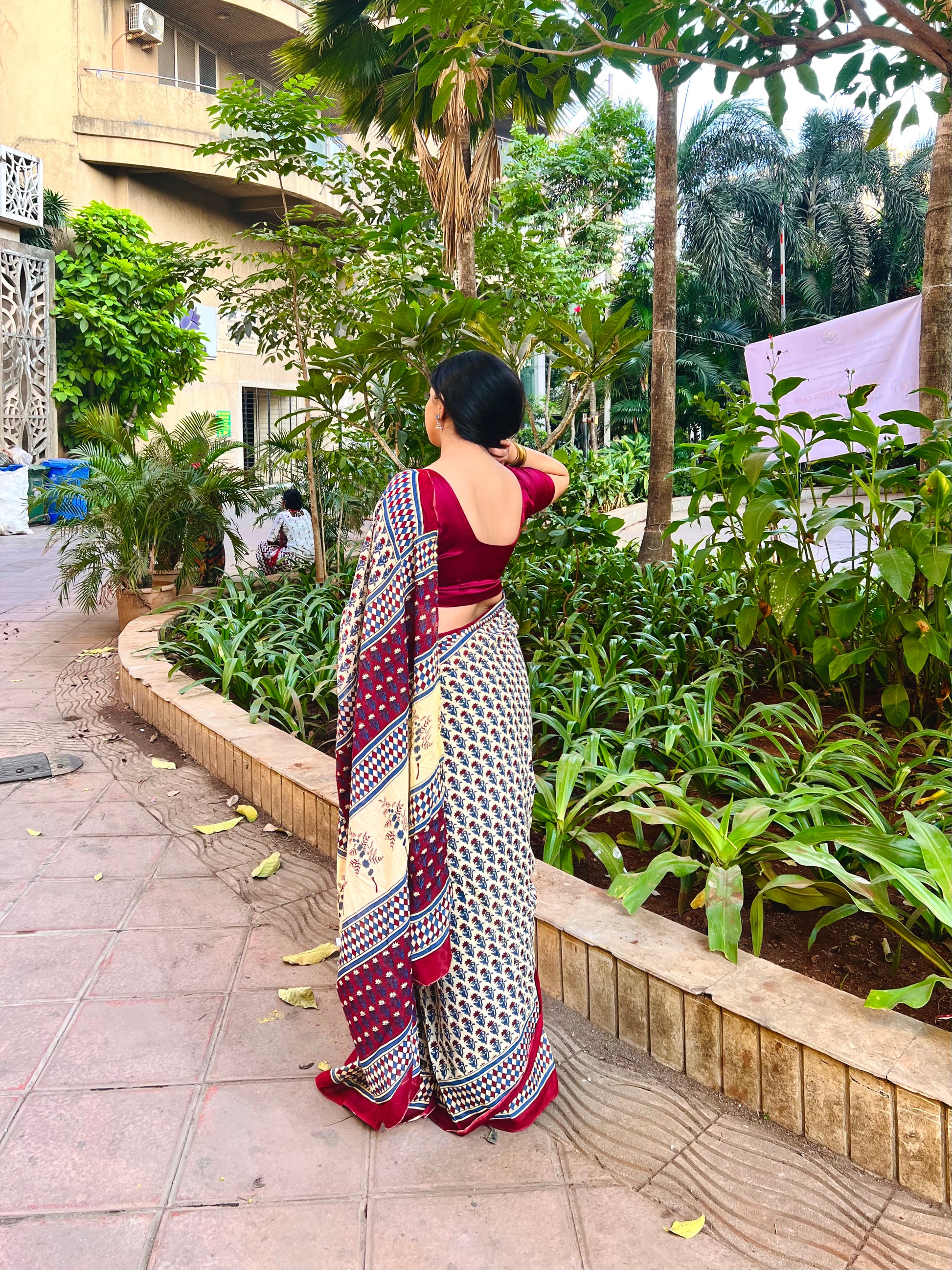 Maroon and Beige Handblock Cotton Saree with Blouse Piece