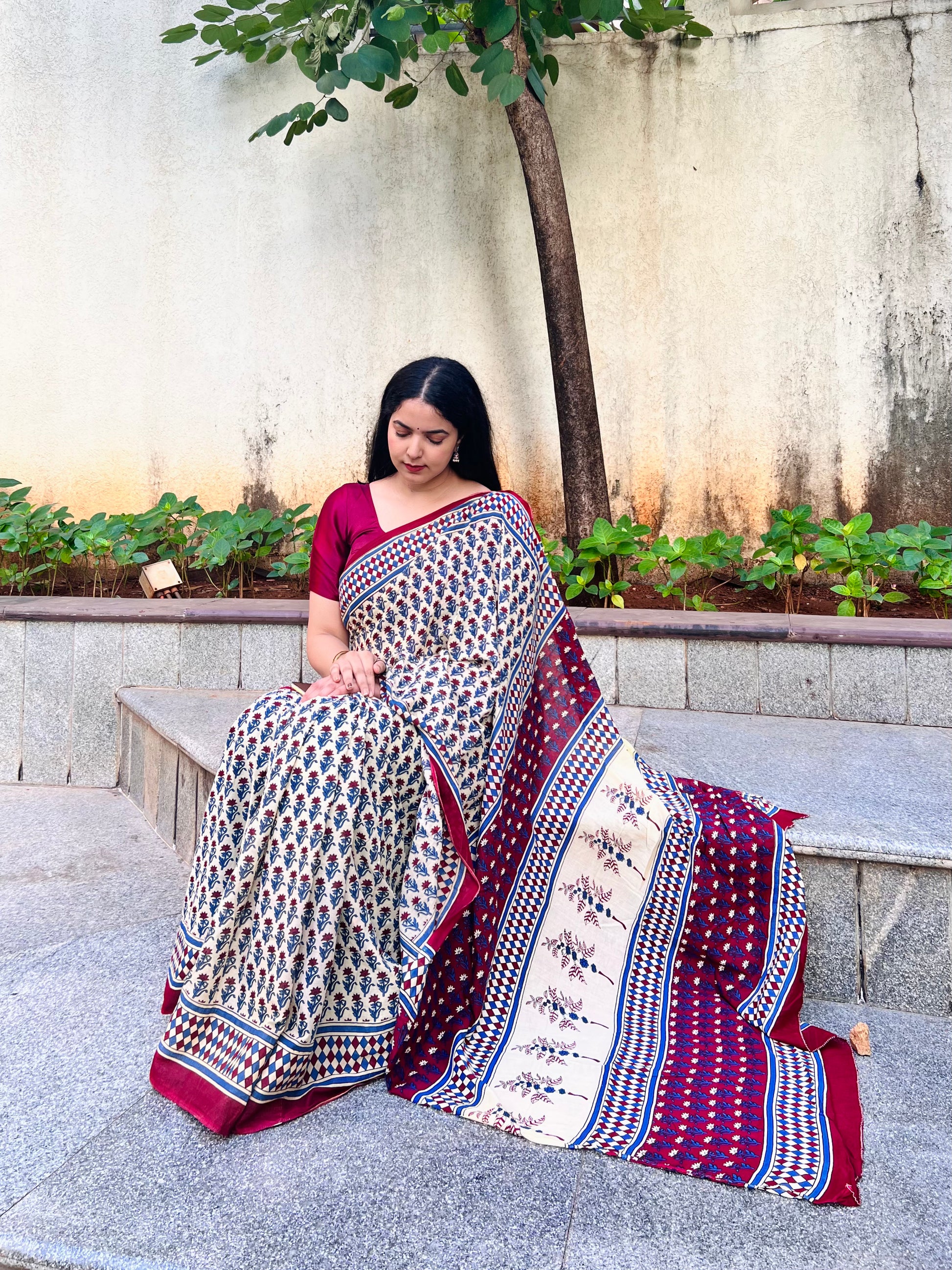 Experience elegance with this handcrafted handblock cotton saree, featuring intricate floral and geometric patterns in maroon, navy blue, and beige. Lightweight, breathable, and versatile, it's perfect for both casual and festive occasions. A timeless blend of tradition and style!